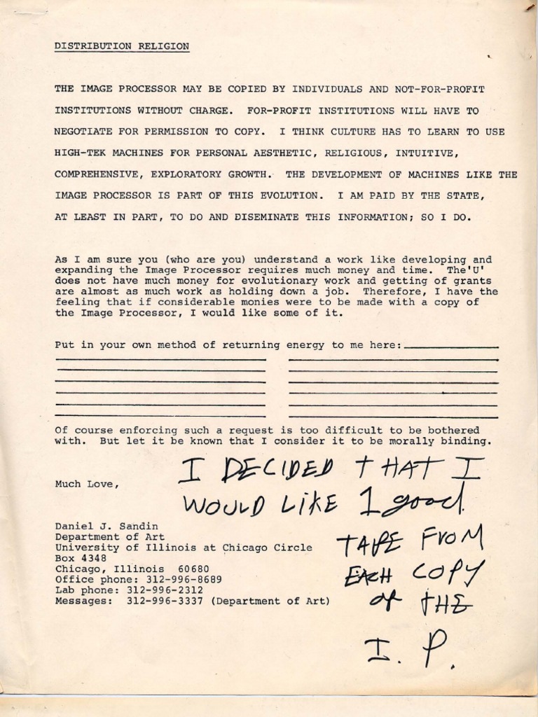 Phil Morton and Dan Sandin created the Distribution Religion, schematic plans for the free reproduction of the Sandin Image Processor, a patch-programmable analog computer optimized for video processing and synthesis developed from 1971 - 1973. Phil Morton developed an approach he called COPY-IT-RIGHT, an anti-copyright approach to making and freely sharing Media Art. The Distribution Religion and Morton's individual and collaborative Media art works were released under his COPY-IT-RIGHT license. COPY-IT-RIGHT encouraged people to make faithful copies, caring for and distributing the work as widely as possible.