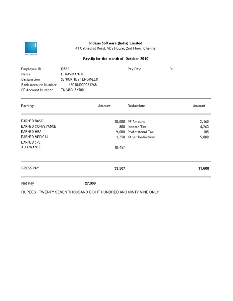 Payslip for the month of October 2010