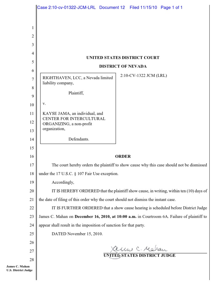 Court Order For Righthaven To Show Cause Regarding Fair Use