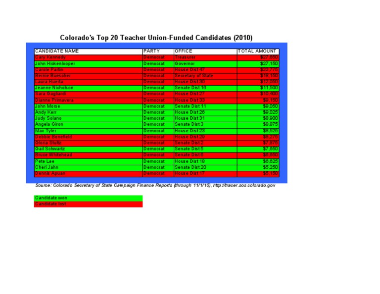Source: Colorado Secretary of State Campaign Finance Reports (through 11/1/10), http://tracer.sos.colorado.gov