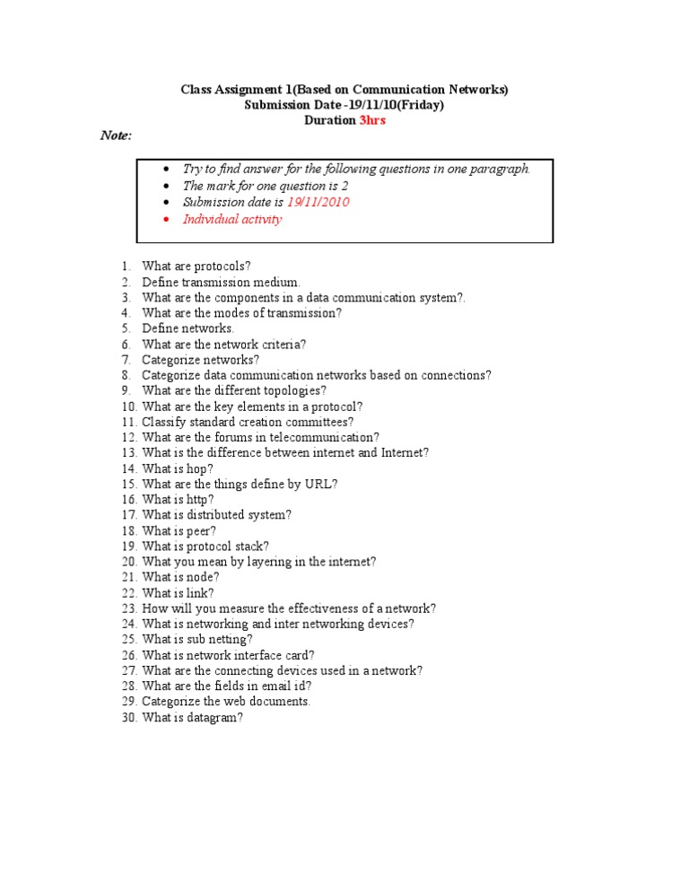 Class Assignment 1(Based on Communication Networks)