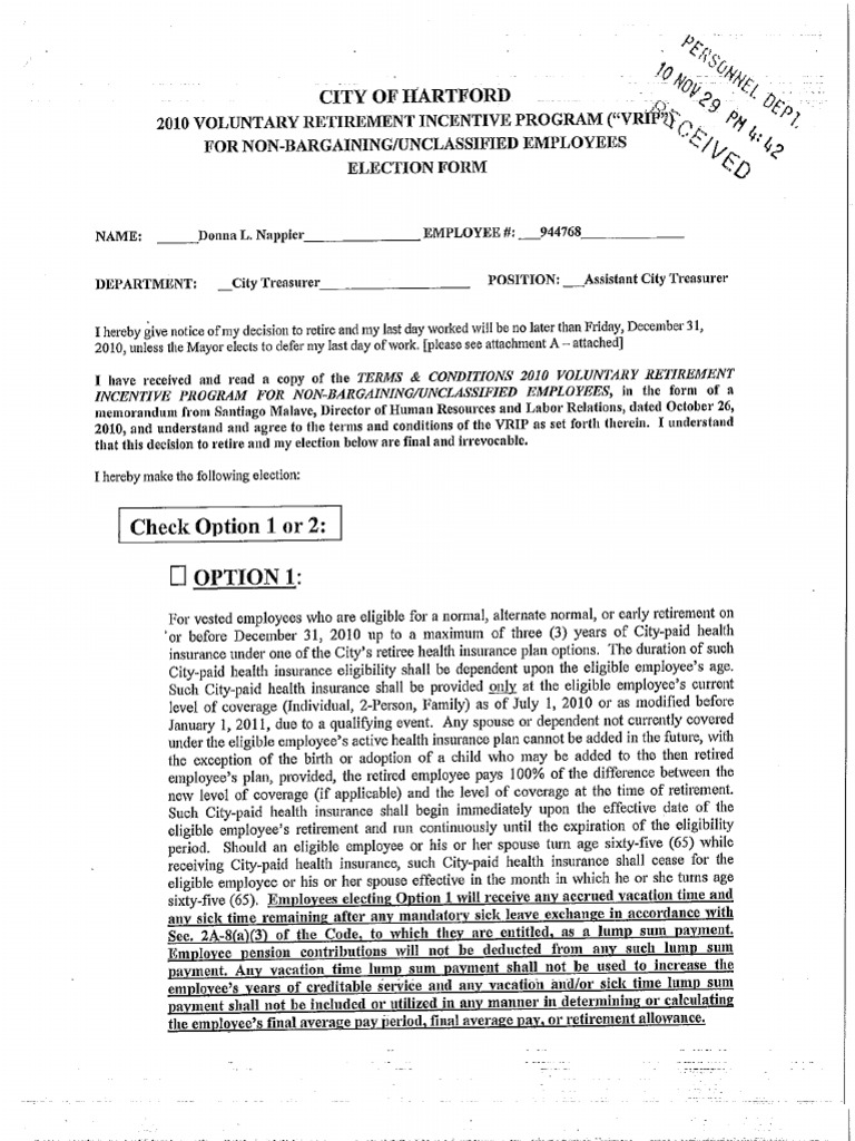 Assistant City Treasurer will retire on friday, December 31, 2010. My last day of work will be unless the Mayor elects to defer my last day. I understand that this decision to retire and my election below are final and irrevocable.