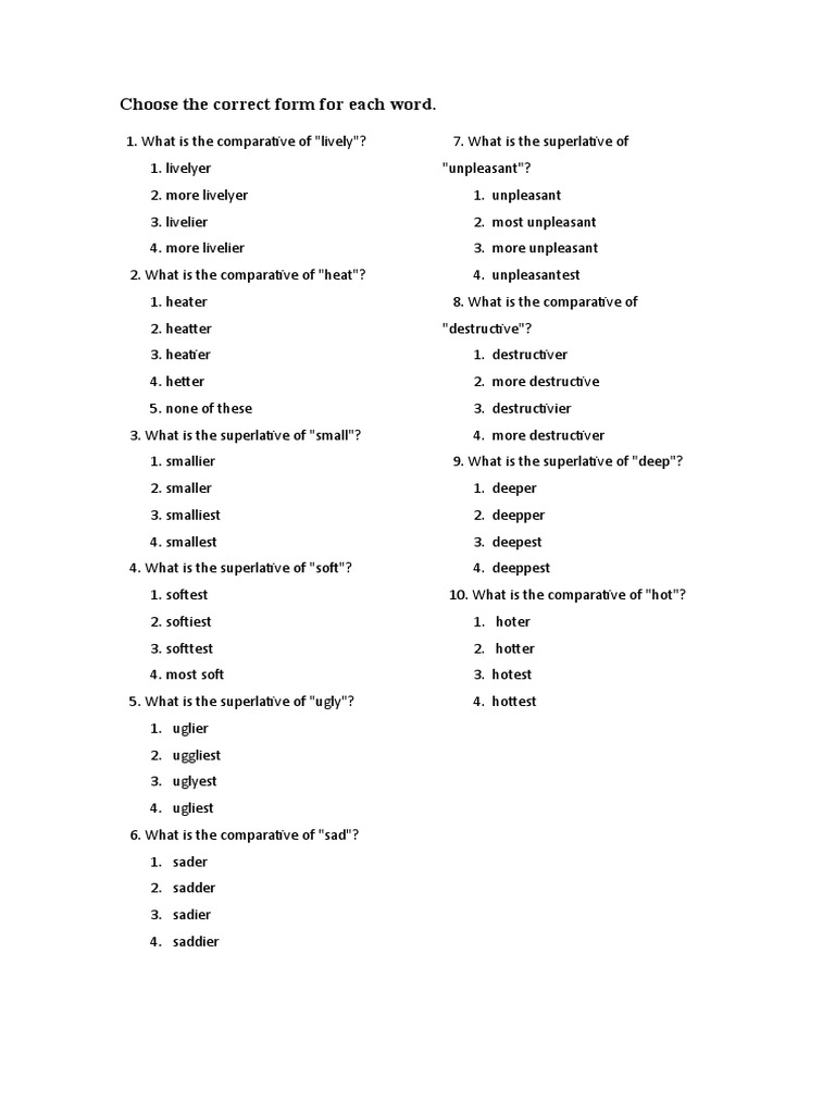 1. What is the comparative of "lively"? 7. What is the superlative of