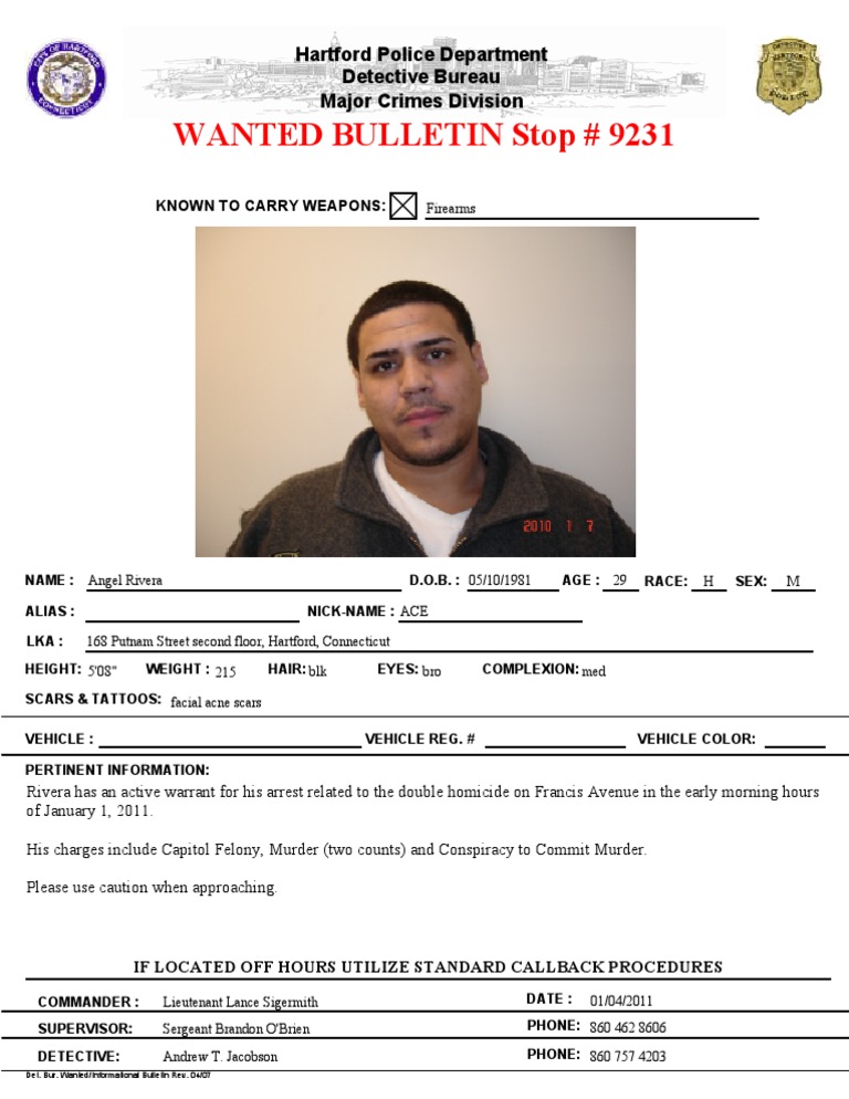 Angel rivera has an active warrant for his arrest related to the double homicide on Francis Avenue in the early morning hours of January 1, 2011. His charges include Capitol Felony, Murder (…