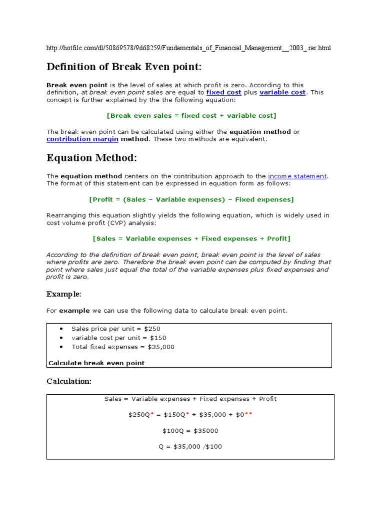 point where sales just equal the total of the variable expenses plus fixed expenses and