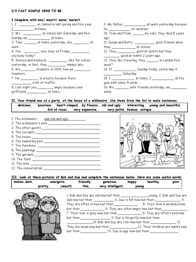 III. Look at these pictures of Bob and Sue and complete the sentences below. Here are some useful words: