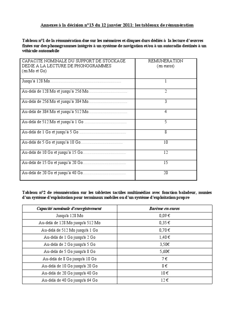 É NOMINALE DU SUPPORT DE STOCKAGE DEDIE A LA LECTURE DE PHONOGRAMMES(en Mo et Go)RÉMUNÉRATION(en euros)Jusqu’à 128 Mo..................................................................1Au-delà de 128 Mo et jusqu’à 256 Mo....................................2Au-delà de 256 Mo et jusqu’à 384 Mo....................................3Au-delà de 384 Mo et jusqu’à 512 Mo....................................4Au-delà de 512 Mo et jusqu’à 1 Go .......................................5Au-delà de 1 Go et jusqu’à 5 Go ...........................................8Au-delà de 5 Go et jusqu’à 10 Go.......................................10Au-delà de 10 Go et jusqu’à 15 Go........................................12Au-delà de 15 Go et jusqu’à 20 Go........................................15Au-delà de 20 Go et jusqu’à 40 Go........................................20