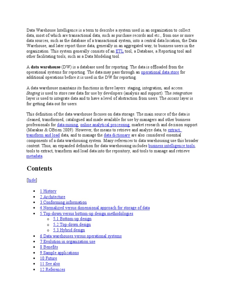 Data Warehouse Intelligence is a term to describe a system used in an organization to collect