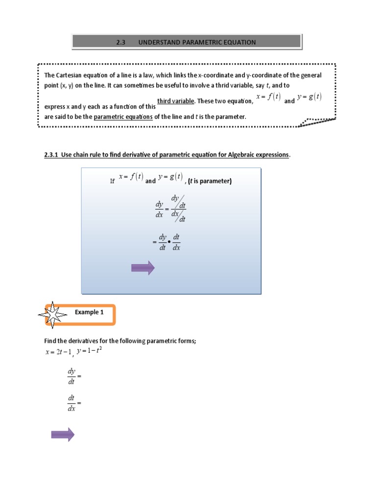 2.3.1 Use chain rule to find derivative of parametric equation for Algebraic expressions.
