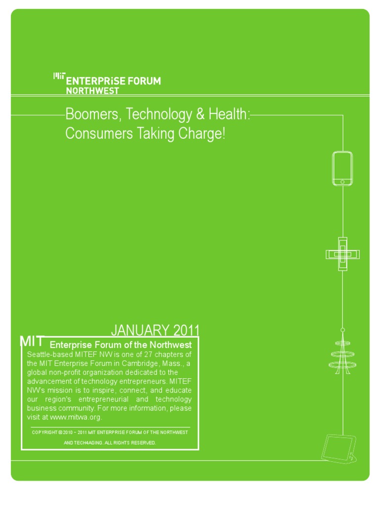 This research report is the result of more than 50 interviews with industry and research thought-leaders conducted between September and December 2010, in preparation for an MIT Enterprise Forum in Seattle on January 19th, 2011. The initial hypothesis was that aging U.S. baby boomers would drive technology innovation across many areas. What we found is that boomers would have a substantial impact in one specific area: the adoption of tech-enabled health and wellness products for personal use.