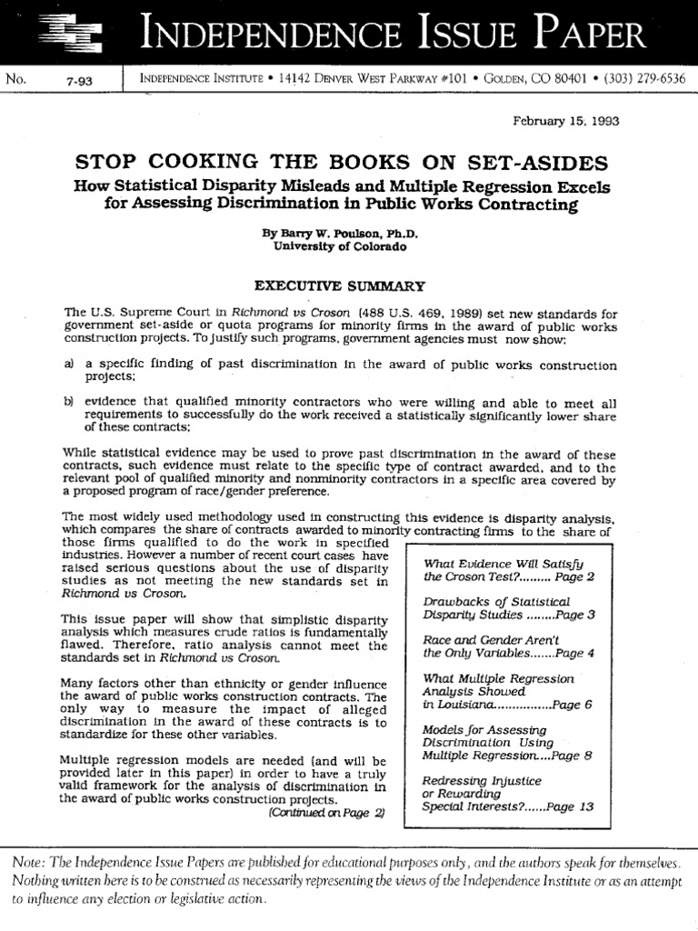 This issue paper will show that simplistic disparity analysis which measures crude ratios is fundamentally flawed. The only way to measure the impact of alleged dtscrtmton in the award of public works construction contracts is to standardize for these other variables.
