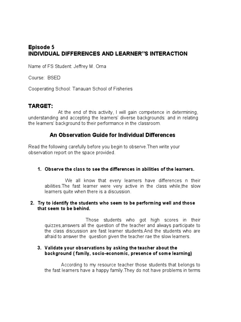 An Obervation Guide For The Learners Characteristics