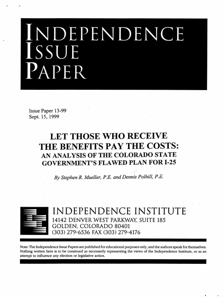 STEPHEN MUELLER is the Independence Institute's Senior Fellow in Transportation. He is a Past President of the Colorado Society of Engineers. In 1993 he was named "Engineer of the Year" by the Colorado chapter of the American Public Works Association. He holds a Masters Degree in Public Administration, and is a registered Professional Engineer.
