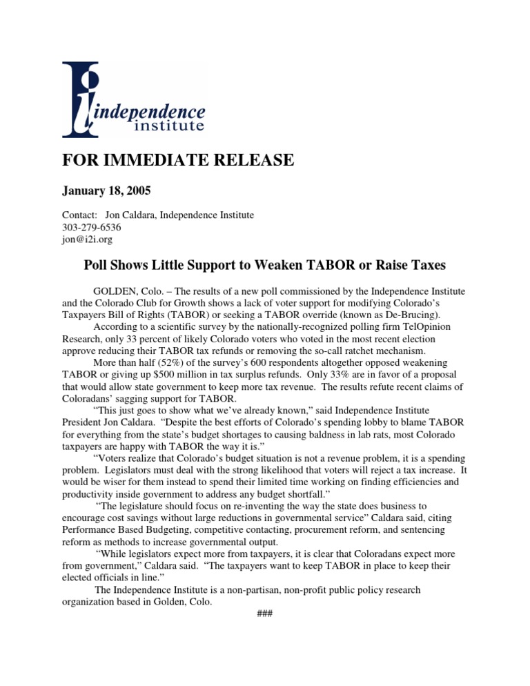 GOLDEN, Colo. – The results of a new poll commissioned by the Independence Institute and the Colorado Club for Growth shows a lack of voter support for modifying Colorado’s Taxpayers Bill of Rights (TABOR) or seeking a TABOR override (known as De-Brucing). According to a scientific survey by the nationally-recognized polling firm TelOpinion Research, only 33 percent of likely Colorado voters who voted in the most recent election approve reducing their TABOR tax refunds or removing the so-call ratchet mechanism. More than half (52%) of the survey’s 600 respondents altogether opposed weakening TABOR or giving up $500 million in tax surplus refunds. Only 33% are in favor of a proposal that would allow state government to keep more tax revenue. The results refute recent claims of Coloradans’ sagging support for TABOR. “This just goes to show what we’ve already known,” said Independence Institute President Jon Caldara. “Despite the best efforts of Colorado’s spending lobby to blame TABOR for everything from the state’s budget shortages to causing baldness in lab rats, most Colorado taxpayers are happy with TABOR the way it is.” “Voters realize that Colorado’s budget situation is not a revenue problem, it is a spending problem. Legislators must deal with the strong likelihood that voters will reject a tax increase. It would be wiser for them instead to spend their limited time working on finding efficiencies and productivity inside government to address any budget shortfall.” “The legislature should focus on re-inventing the way the state does business to encourage cost savings without large reductions in governmental service” Caldara said, citing Performance Based Budgeting, competitive contacting, procurement reform, and sentencing reform as methods to increase governmental output. “While legislators expect more from taxpayers, it is clear that Coloradans expect more from government,” Caldara said. “The taxpayers want to keep TABOR in place to keep their elected officials in line.” The Independence Institute is a non-partisan, non-profit public policy research organization based in Golden, Colo. ###
