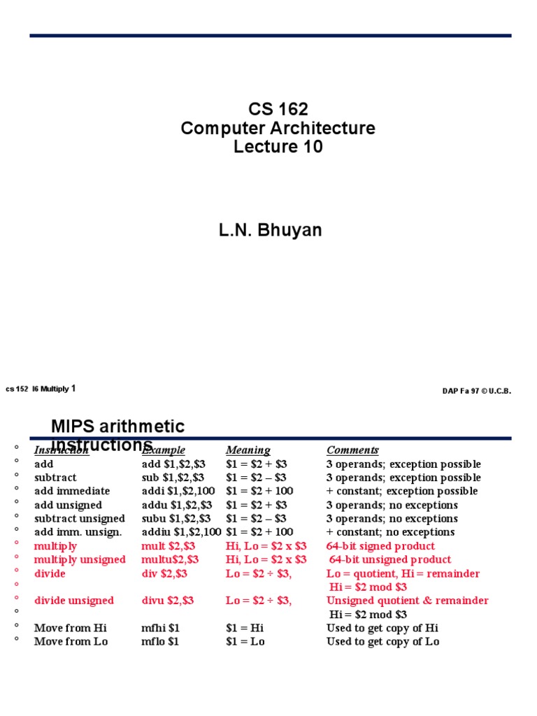 ° multiply mult $2,$3 Hi, Lo = $2 x $3 64-bit signed product