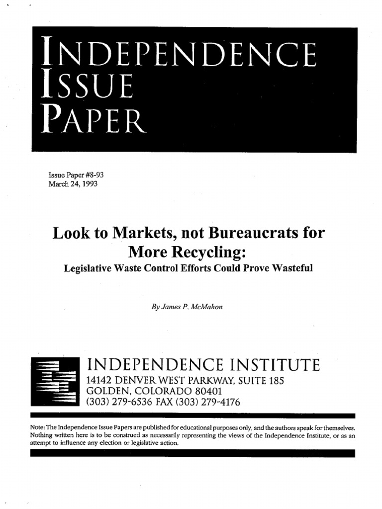 JAMES P. McMAHON is an ecologist and a Senior Fellow at the Independence Institute. He developed Seattle's original recycling strategy in 1980. The Seattle program achieved a 22% diversion rate by relying on variable trash rates and private sector collaboration.