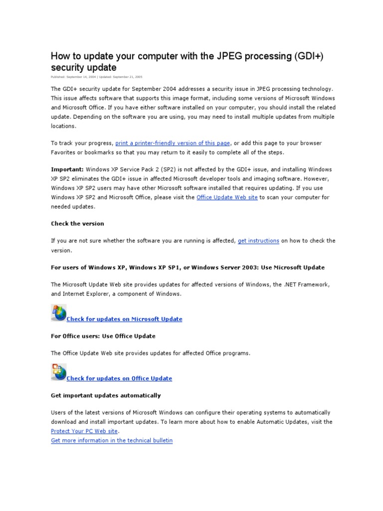Important: Windows XP Service Pack 2 (SP2) is not affected by the GDI+ issue, and installing Windows