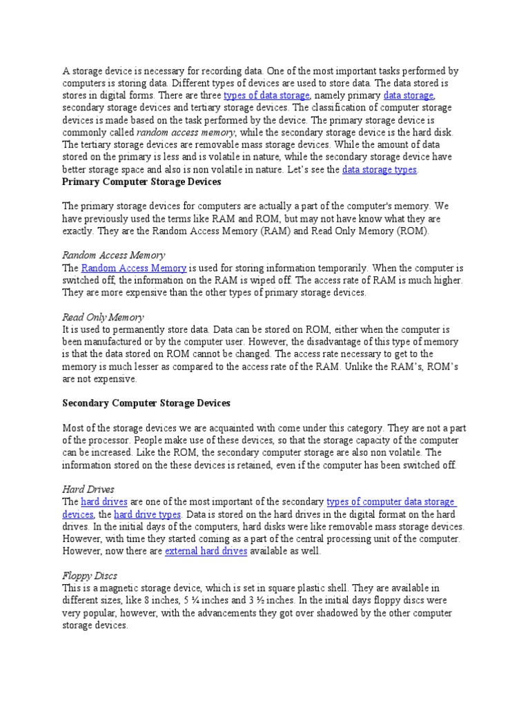 computers is storing data. Different types of devices are used to store data. The data stored is