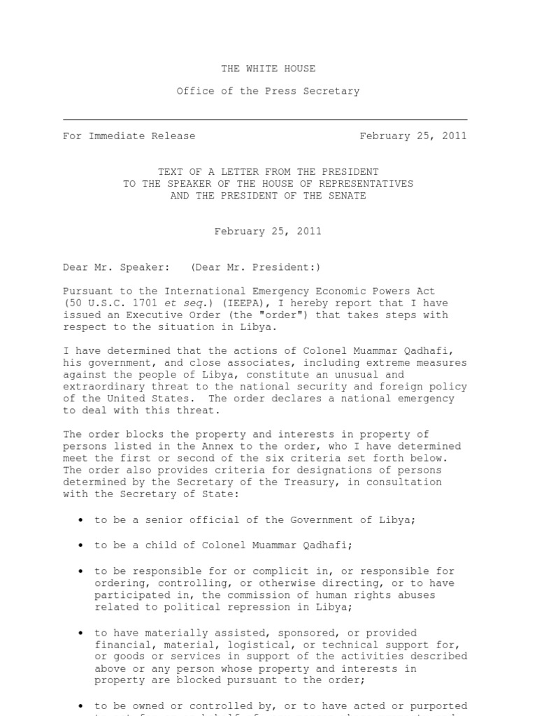 1) President Obama issued an executive order declaring a national emergency regarding the situation in Libya and Colonel Muammar Qadhafi's actions against the Libyan people.