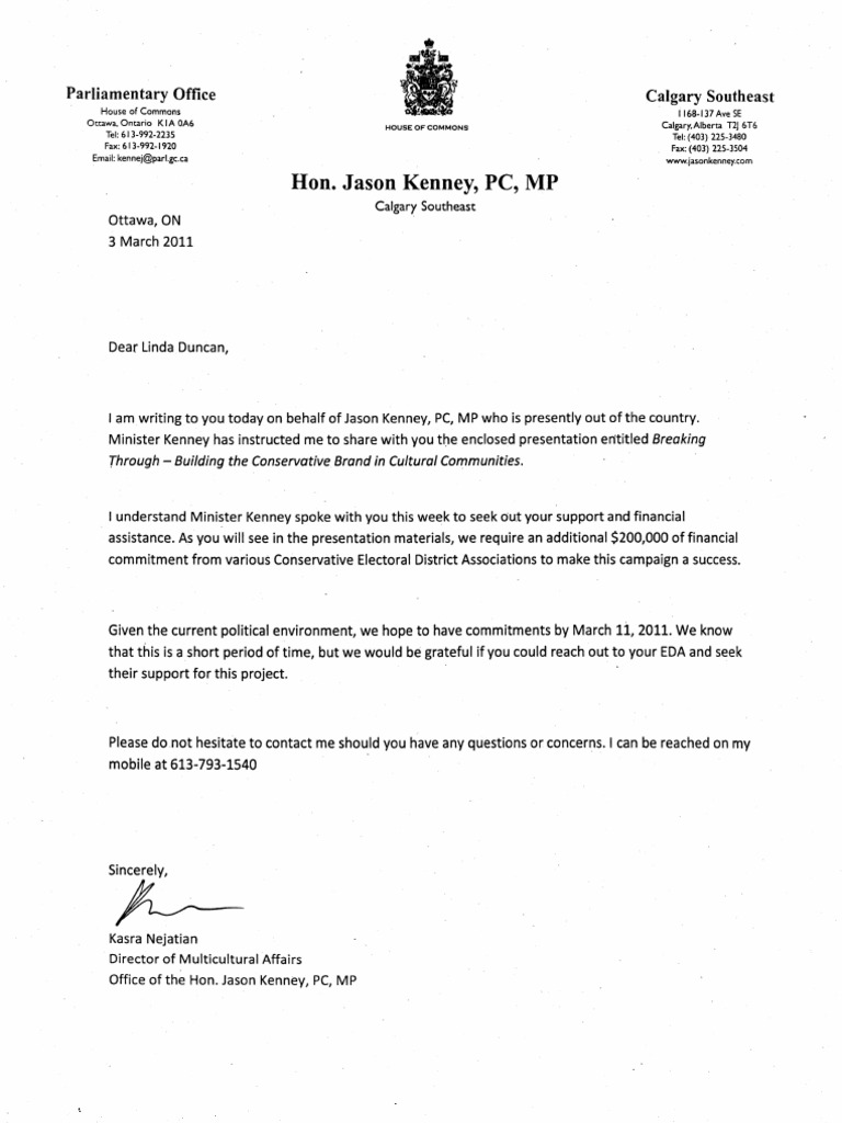 1amwritingto you today on behalf of Jason Kenney, PC, MP who is presently out of the country.