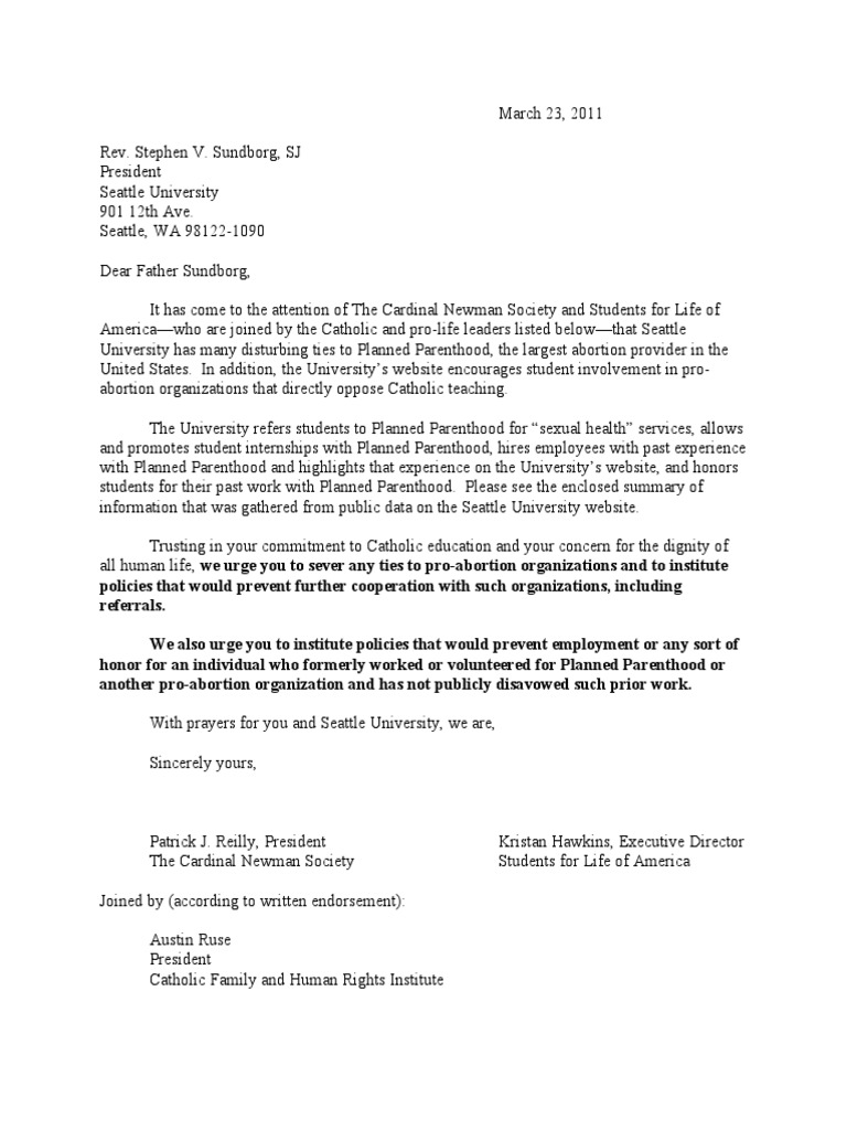 With prayers for you and Seattle University, we are,Sincerely yours,Patrick J. Reilly, President Kristan Hawkins, Executive Director The Cardinal Newman Society Students for Life of AmericaJoined by (according to written endorsement):Austin RusePresidentCatholic Family and Human Rights Institute