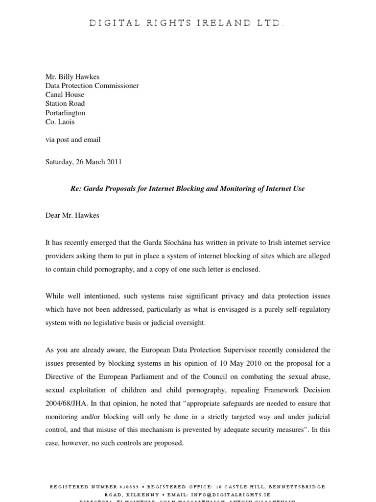 . If, for example, a user tries to accesswww.example.com/users/JohnDoe and is presented with such a page, it is very likely thatthey will infer that John Doe has been involved in the distribution of child pornography.In summary, therefore, it appears to Digital Rights Ireland that the Garda proposals forblocking present very serious data protection issues and we would request that before any