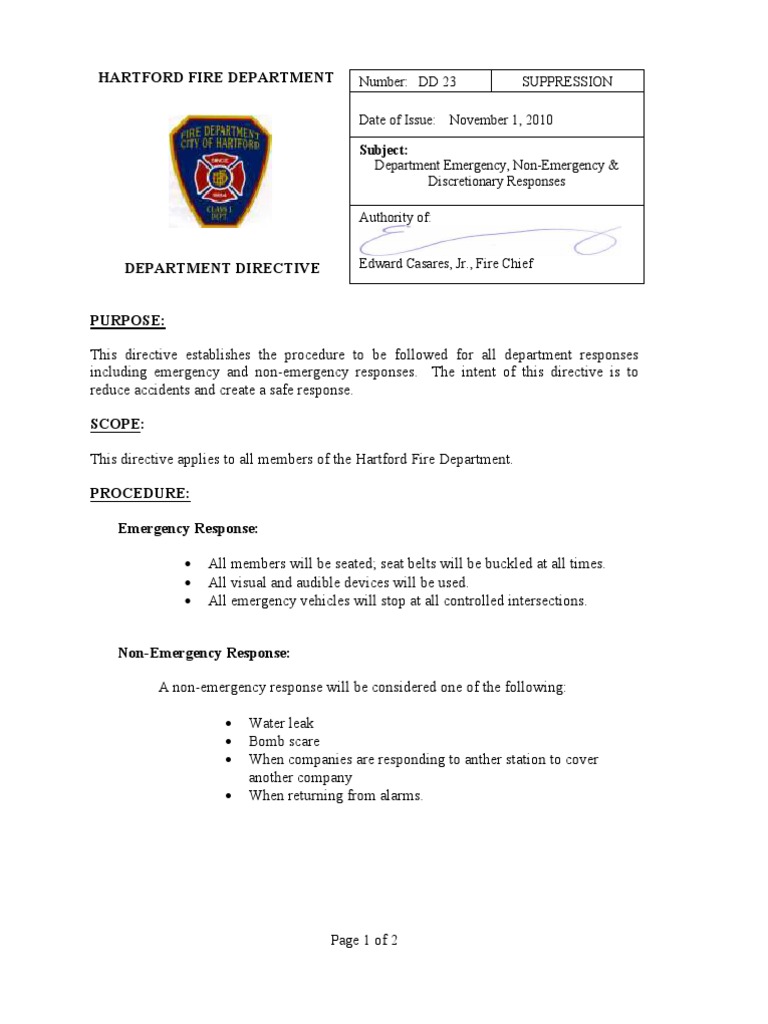 This directive establishes the procedure to be followed for all department responses including emergency and non-emergency responses. The intent of this directive is to reduce accidents and create a safe response. All members will be seated; seat belts will be buckled at all times. All visual and audible devices will be used. All emergency vehicles will stop at all controlled intersections.