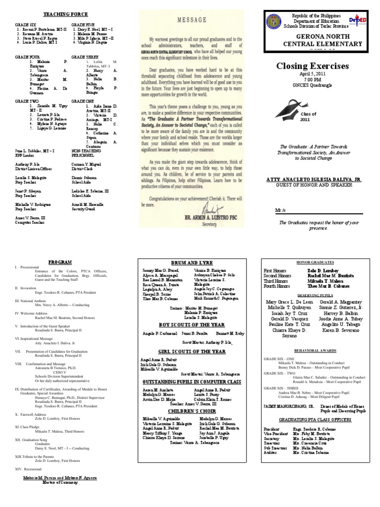 Entrance of the Colors, PTCA Officers, Jeanzy Mae G. Bucad, Venice B. Enriquez First Honors Zolo D. Lomboy