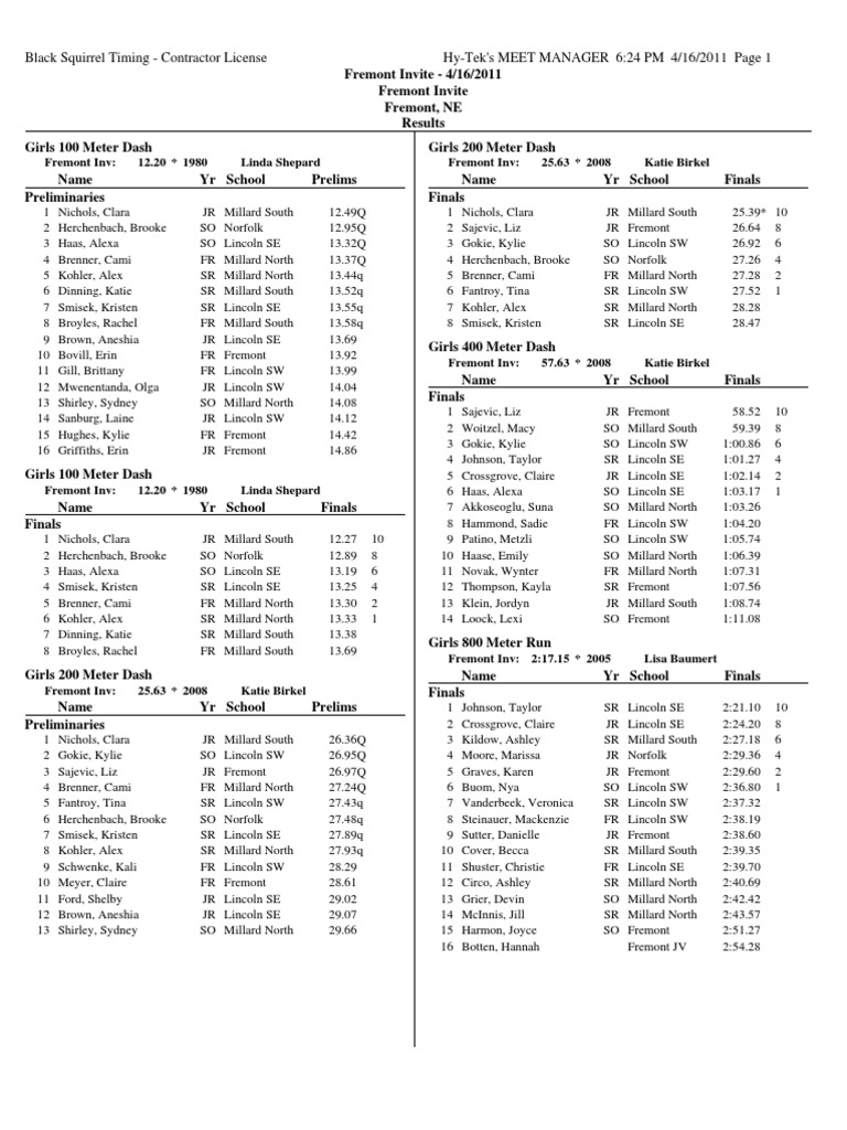1 Nichols, Clara JR Millard South 12.49Q 1 Nichols, Clara JR Millard South 25.39* 10