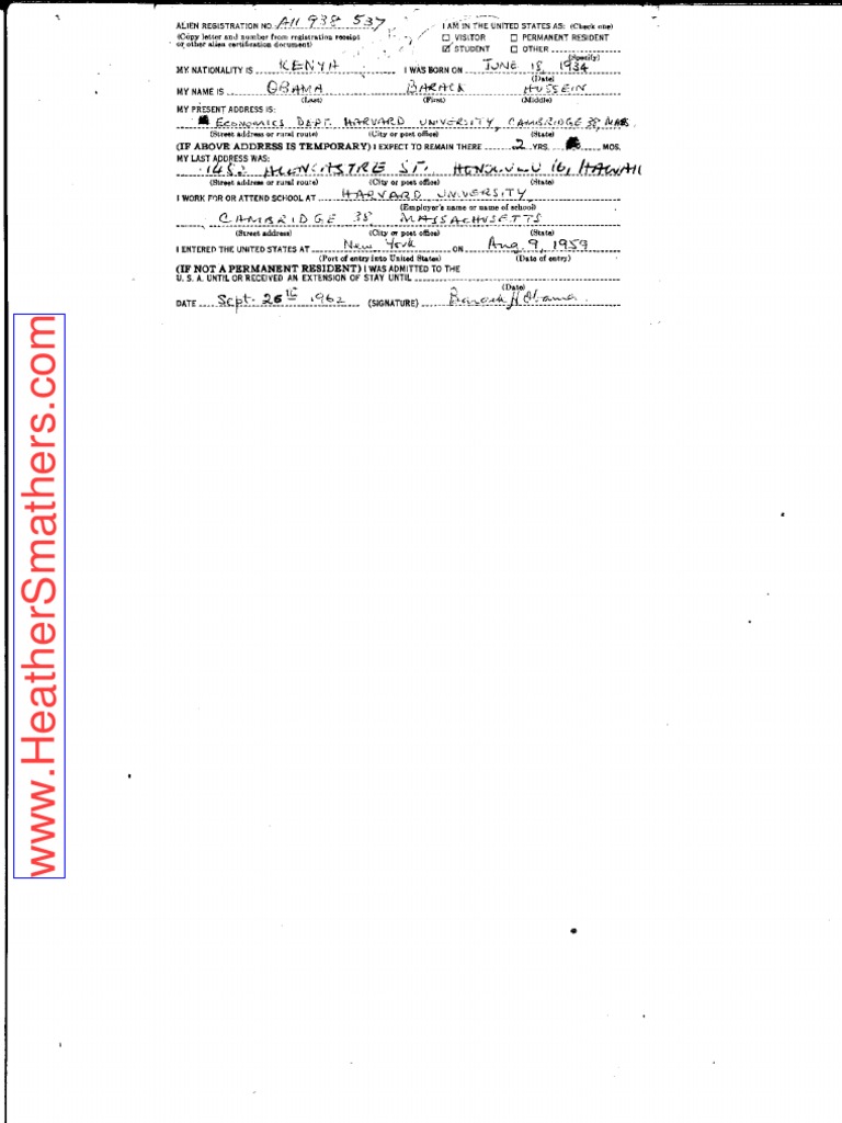 Obtained from US Customs and Immigration Services via Freedom of Information Act request. Documents show President Obama to have been born in Hawaii and Obama Sr. to have been a polygamist.