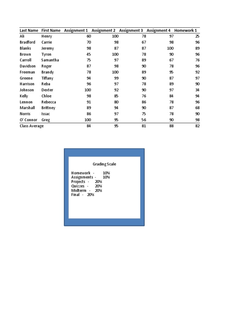 Last Name First Name Assignment 1 Assignment 2 Assignment 3 Assignment 4 Homework 1