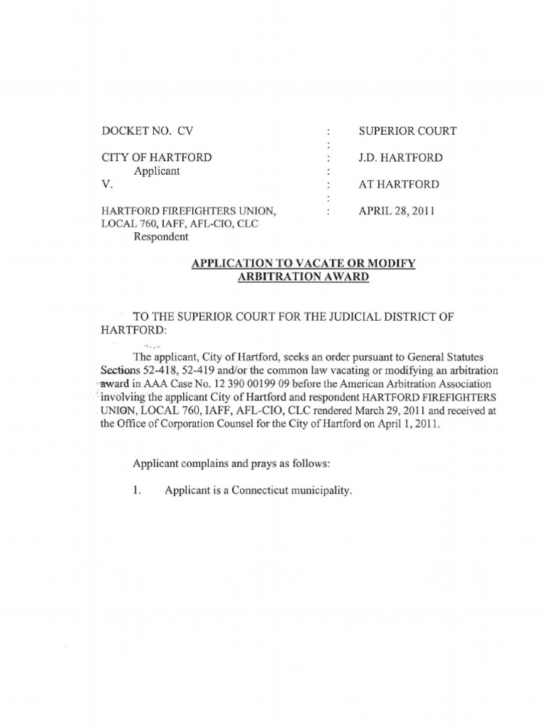 The applicant, City of Hartford, seeks an order pursuant to General Statutes Sections 52-418, 52A19 and / or the common law vacating or modifying an arbitration -award in AAA Case No. 123900019909 before the american arbitration association.