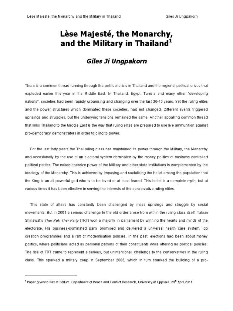 Lèse Majesté, the Monarchy and the Military in Thailand Giles Ji Ungpakorn