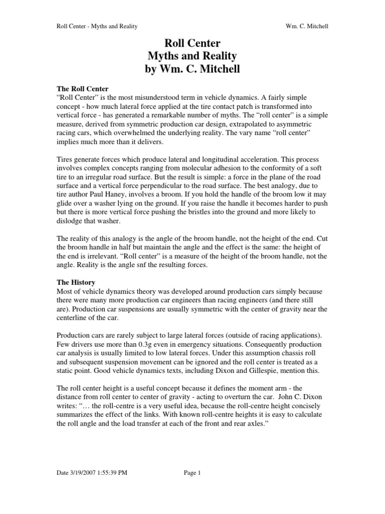 "Roll center" is a simple measure, derived from symmetric production car design. Reality is the angle of the broom handle, not the height of the end. Production cars are rarely subject to la…