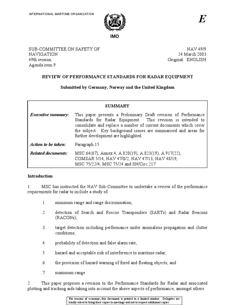 8 A preliminary draft revision of the Performance Standards for Radar is given at annex. It