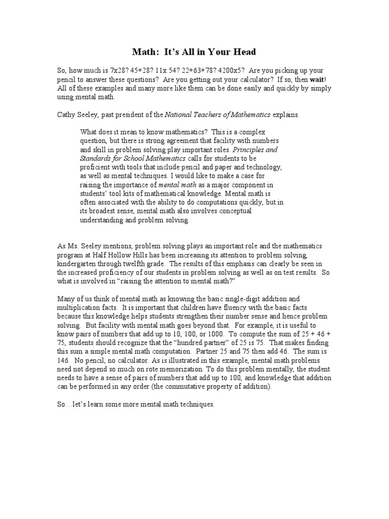 solving. But facility with mental math goes beyond that. For example, it is useful to