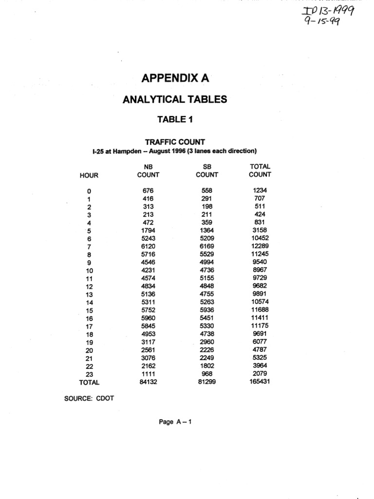 TP RB-499 9-15-94 APPENDIX A ANALYTICAL TABLES TABLE 1 TRAFFIC COUNT 1-25 at Hampden — August 1996 (3 lanes each direction) NB SB TOTAL HOUR COUNT COUNT COUNT oO 676 558 1234 1 416 291 ‘707 2 313 198 511 3 213 211 424 4 472 359 831 5 1794 1364 3158 6 5243 5209 10452 7 6120 6169 12289 8 5716 5529 11245, 9 4546 4994 9540 10 4231 4TH 8967 11 ‘4574 ‘5155, 9729 12 4834 4848 9682 13 5136 4755 9891 14 5311 5263 10574 15 5752 5936 11688 16 5960, 5451 11411 17 5845 5330 11175 18 4953 4738 9691 19 317 (2960 6077 20 (2561 (2226 ‘4787 21 3076 2249 5325, 22 2162 1802 3964 23 4111 968 (2079 TOTAL 84132 81299 165431 SOURCE: CDOT Page AANNOSHLNOS — GNNOSH.LYON —| NN = o- © Lop NOILNGIYLSIC OlssdVaL Se-lTABLE 2 CONFIGURATION POSSIBLITIES CONFIGURATION GENERAL PURPOSE TOLL ‘SUBSEQUENT NUMBER LANES LANES LRT DESIGNATION 1 3 ° ° 300 2 4 0 0 400 3 5 0 0 5.00 4 6 ° 0 600 5 3 ° 1 304 6 4 oO 1 404 7 5 ° 1 5.04 8 3 1 0 34-0 9 4 1 ° 44-0 10 5 1 0 54-0 1 3 1 1 a4 12 4 1 1 444 13 3 2 0 320 14 4 2 0 420 15 3 2 1 324 16 3 3 ° 330 7 2 3 0 230 18 2 3 1 234 19 2 4 0 240 20 1 4 1 1-44 2 1 4 ° 14.0 2 1 5 0 150 Page A-3TABLE 3 CAPITAL CONSTRUCTION COST OF ALL CONFIGURATIONS GENERAL CONFI HIGHWAY = LRT TOTAL PURPOSE HOT GURA CAP COST CAP COST CAP COST NUMB LANES LANES LRT TION (MILLION) (MILLION) (MILLION) 1 3 0 0 300 $0 $0 $0 2 4 0 0 400 $571 $0 $571 3 5 0 0 500 $1,143 $0 $1,143 4 6 0 0 600 $1,714 $0 $1,714 5 3 ° 1 304 $0 $883 $883 6 4 Oo 4 401 © $571 $ee3 $1,454 7 5 0 14 S01 $1143 $883 $2,025 8 3 1 Oo 340 © $571 $0 $571 9 4 1 0 440 $1,143 $0 $1,143 10 5 1 0 54.0 $1,714 $0 $1,714 " 3 1 1 344 $571 sees ($1,454 12 4 1 1 44-4 $1,143 $ee3 $2,025 13 3 2 0 320 $1,143 $0 $1,143, 14 4 2 0 420 $1,714 $0 $1,714 15 3 2 4 324 $1,143 $883 ($2,025 16 3 3 0 330 $4,714 $0 $1,714 7 2 3 0 230 $1,143 $0 $1,143, 18 2 3 1 234 $1,143 $883 «$2,025 19 2 4 0 240 $1,714 $0 $1,714 20 1 4 4 444 $1,143 $883 $2,025 2 1 4 0 140 $1,143 $0 $1,143 22 1 5 0 150 $1,714 $0 $1,714 Page A-4TABLE 3A CAPITAL CONSTRUCTION COST OF ALL CONFIGURATIONS GENERAL, CONFI HIGHWAY LRT TOTAL PURPOSE HOT GURA CAP COST CAP COST CAP COST NMBR LANES LANES LRT TION (MILLIONS) (MILLIONS) (MILLIONS) 1 3 0 0 300 $0 $0 $0 2 4 0 0 400 $574 $0 $571 8 3 1 0 500 $571 $0 $571 5 3 o 1 600 $0 $883 $883 3 5 0 0 304 $1,143 $0 $1,143 9 4 1 0 401 $1,143 so $1,143 13 3 2 0 S01 $1,143 $0 $1,143 7 2 3 0 310 $1,143 $0 $1,143 a 1 4 0 440 $1,143 $0 $1,143 6 4 Oo 4 $4.0 © $574 ‘$883 $1,454 " 3 1 1 34-4 $571 $883 $1,454 4 6 0 0 444 $1,714 $0 $1714 10 5 1 0 320 $1,714 $0 $1,714 14 4 2 0 420 $1,714 $0 $1,714 16 3 3 0 324 $1714 $0 $1714 19 2 4 0 330 $1,714 $0 $1,714 2 1 5 0 230 $1,714 $0 $1,714 7 5 0 1 234 $1,143 $883 $2,025 12 4 1 1 240 © $1,143 $883 $2,025 15 3 2 1 144 $1,143 $283 $2,025 18 2 3 1 1640 $1,143 $883 $2,025 20 1 4 4 150 $1,143 $883 $2,025 Page A-5ALL LANES 45MIN HOUR COUNT MIDNIGHT 450 1:00 300 2:00 200 3:00 200 4:00 200 5:00 350 6:00 1000 7:00 1400 8:00 1350 9:00 1300 10:00 1200 11:00 1200 NOON — 1300 13:00 1300 14:00 1700 15:00 2100 16:00 2200 17:00 2300 18:00 2200 49:00 2000 20:00 1400 21:00 1200 22:00 1000 23:00 750 TABLE 4 91 FREEWAY EB FEB. 1997 — TRAFFIC AND REVENUE ANALYSIS ALL LANES PH 1800 1200 800 800 800 1400 HOT. FREE LANES HOT LANES FREE 15MIN LANES 15MIN LANES COUNT VPHILN COUNT VPHILN ° 0 450 450 0 ° 300 300 ° 0 200 © 200 ° o 200 © 200 0 0 200 200 ° 0 350 350 40 80 = 960960 60 120 13401340 60. 120 1290 1290 40 80 = 12601260 30 60 ©1170-1170 40 80 1160 1160 50 100 12501250 90 = 18012101210 130 260 «15701870 350 700 17501750 560 1120 1640-1640 690 1380 «1610 «1610 540 1080 16601660 300 600 © 17001700 100 200» 13001300 7 = 15011251125 50 100 © 950950 25 50 7250725 TOLL RATE $0.50 $0.50 $0.50 $0.50 $0.50 $0.50 $0.50 $0.50 $0.50 $0.50 $0.50 $0.50 $0.50 $1.00 $1.50 $2.75 $2.75 $2.75 $2.75 $1.50 $1.00 $0.50 $0.50 $0.50 TOTAL TOLL REVENUE 120.00 120.00 180.00 60.00 80.00 100.00 360.00 780,00 3,850.00 6,160.00 7,590.00 5,940.00 1,800.00 "400.00 150.00 100.00 50.00 $ 27,820.00 PER DAY PAP AOODOODOODDODOOAOOBDA NOTE: WHEN FREE LANE VOLUME EXCEEDS 1500 VPH/LANE, MARKET CAPTURE RATE. EXCEEDS 10% SOURCE: RAW TRAFFIC DATA EXTRACTED FROM CALPOLY STUDY Page A-6 MARKET CAPTURE RATE 0% 0% 0% 0% 0% 0% 4% 4% 4% 3% 3% 3% 4% 7% 8% 17% 25% 30% 25% 15% 7% 6% 5% 3%TABLE 5 TRAFFIC GROWTH ESTIMATES — 2.6% PER YEAR 1-25 AT HAMPDEN — NORTHBOUND BASE-ZERO SYEARS 10 YEARS 15YEARS 20YEARS 25 YEARS 1996 2001 ©2006 2011 2016 2021 HOUR COUNT COUNT COUNT COUNT COUNT COUNT 0 676 7m 872 994 1129 1284 1 416 474 5837 612 695 790 2 313 357 404 460 523 595 3 213 243 275 313 356 405 4 472 538 609 694 788 897 5 1794 2045 «2314 2637 2996 3409 6 5243 5977 «6763, 7707 8756 9962 7 6120 69777895 8996 1022011628 8 5716 6516 7374 2403 9546 10860 9 4546 51825864 6683 7592 8637 10 4231 48235458 6220 7066 2039 "1 4574 5214 5900 6724 7639 8691 12 4834 5511 6236, 7106 8073 9185 13 5196 5855 6625 7550 8577 9758 14 5311 6055 «6851 7807 8869 10091 15 5752 6557-7420 8455 9606 10929 16 5960 67947688 8761 995311324 7 5845 66637540 8592 9761 11106 18 4953 5645 6389 7281 8272 9411 19 3117 35534021 4582 5205 5922 20 2561 2920-3304 3765 4277 4866 2 3076 3507-3968 4522 5137 5844 2 2162 2465 (2789 3178 3611 4108 23 1111 12671433 1633 1855 2411 TOTAL 84132 95010 108530 123674 © 140500159851 Page A-7.TABLE 6 ‘SUMMARY OF VARIABLE TOLL GROSS REVENUE ESTIMATES CONFIGU- NMBR RATATION 1 300 2 400 3 500 4 600 5 304 6 404 7 5.04 8 310 9 410 10 540 W344 1200 444 13 3:20 14 420 15 3.24 16 330 7 230 18 234 19 240 200 144 2 140 2 150 DAILY TOLL REVENUE POTENTIAL IN 2006 88,476.00 45,943.00 821.00 $ 88,476.00 $ 49,468.00 $ 119,916.00 $ 26,621.00 $ 119,916.00 $ 87,628.00 $213,824.00 $ 213,824.00 $ 169,553.00 $ 322,647.00 $ 322,647.00 '$ 268,505.00 ODOOOO0008 DAILY TOLL REVENUE. POTENTIAL IN 2011 Ooonnee $ 98,281.00 $ 105,643.00 $ 23,726.00 $ 98,281.00 $156,574.00 $ 167,462.00 $ 82,187.00 $ 167,462.00 $ 164,369.00 $271,102.00 $271,102.00 $260,172.00 $387,191.00 $387,191.00 $270,832.00 NUMBER NUMBE