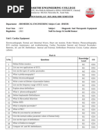 It involves compilation and storing of information relatin to audia, video and clips, ECG, etc,.. 10. What is mean by Real time concepts. It involves the real time exchange of information between the two centres simultaneously and communication interactively. 11. Define arrhythmia. Any disturbances in the hearts normal rhythmic contraction is called arrhythmia. Patients undergoing uneventful recovery from myocardial infarction may be develop cardiac arrest and immediate result of cardiac defibrillation. 12. What are the diagnostic statements observed from the ECG records. Morphological statement based on ECG waveshapes. Rhythm statement- concerned with the site and the rate of cardiac pacemaker. 13. Write short notes on arrhymia monitor. It is a alarm system. It is not an ECG interpretation system. Constantly scans ECG rhythm pattern and issues alarm to events that may be premonitory or life threatening. 14. What are the major system consist in arrhymia monitor. Signal conditioning block Noide detection. Qrs detection Morphology characterization. Timing classification. Beat labeling. Rhythm labeling. Atrial fibrillation detection. Ventricular fibrillation. Alarms. 15. Write short notes on e-Health. It is a relatively recent term for health care practice which is supported by electronic process and communication. [Link] is meant by transducer? The device convert one form of energy to another form of energy is called transducer. 17. Define: Radio Telemetry systems Most biotelemetry systems are involved with radio transmission and reception of [Link] are single channel and multichannel telemetry system. 18. What is meant by transmission of bioelectric variables? SCT-ECE DEPARTMENT