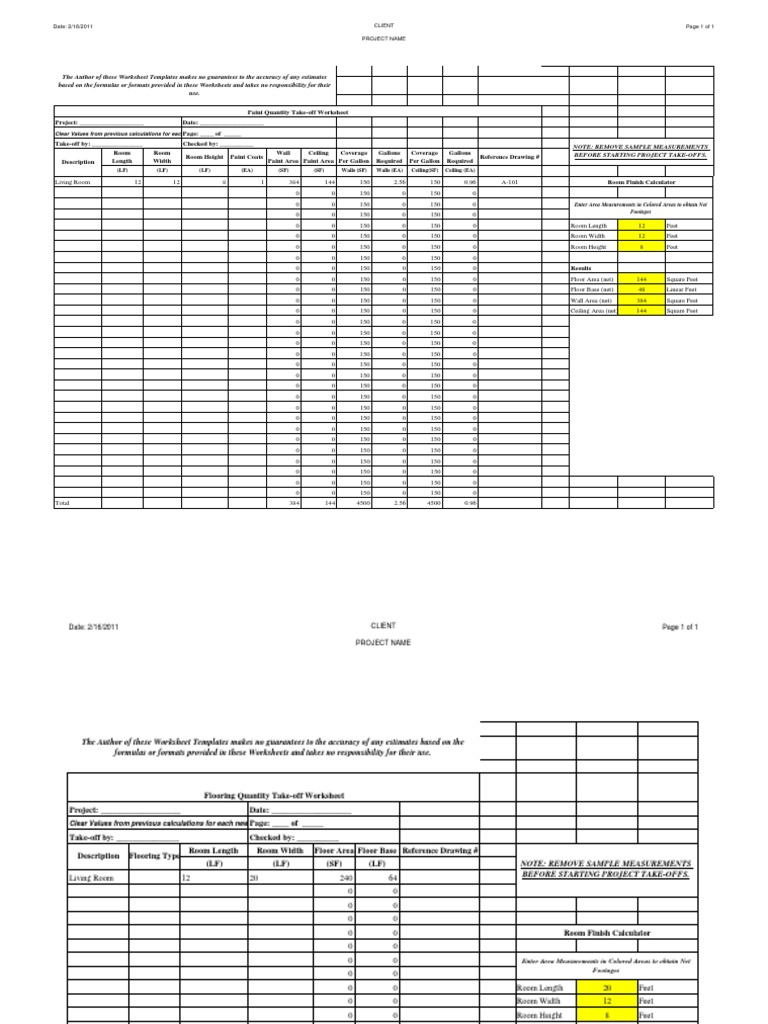 The Author of these Worksheet Templates makes no guarantees to the accuracy of any estimates based on the formulas or formats provided in these Worksheets and takes no responsibility for their use. Paint Quantity Take-off Worksheet Project: ___________________ Take-off by: _______________ Room Length Description