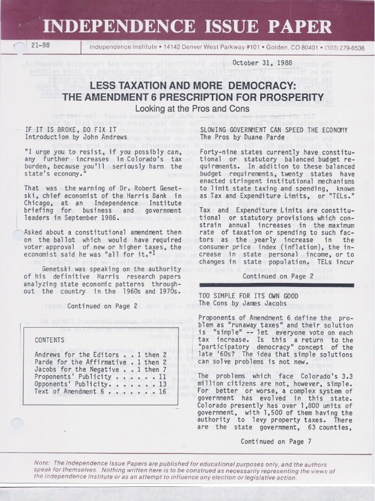 Proponents of amendment 6 define the problem as "runaway taxes" their solution is "simple" -- let everyone vote on each tax increase. The problems which face Colorado's 3. Million citizens are not simple, however. A complex system of government has evolved in this state.