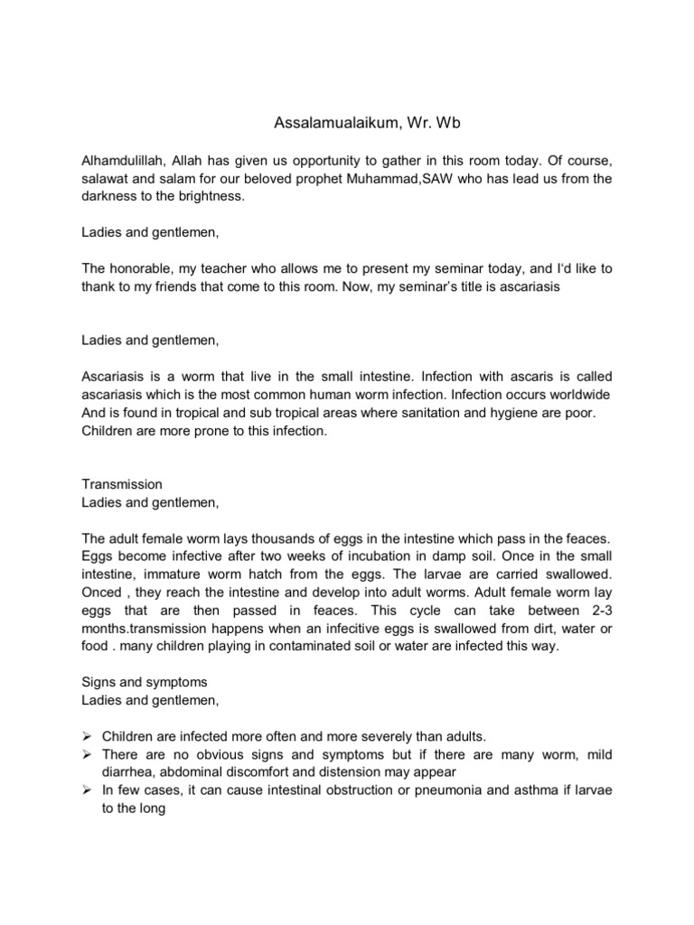 Alhamdulillah, Allah has given us opportunity to gather in this room today. Of course, salawat and salam for our beloved prophet Muhammad,SAW who has lead us from the darkness to the brightness. Ladies and gentlemen, The honorable, my teacher who allows me to present my seminar today, and Id like to thank to my friends that come to this room. Now, my seminars title is ascariasis