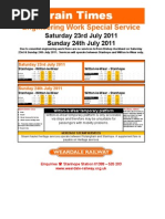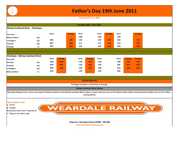 STEAMSERVICES HeritagetimetableisidentifiedinOrange. BishopAucklandWestStation WeardaleRailwaytrainsarriveanddepartBishopAucklandattheBishopAucklandWeststationashortdistancewestoftheNationalRailstation(situatedbehindB&QandthePostOffice sortingoffice) AbbreviationsUsed aArrive dDepart Qdenotesonlyrunsifrequiredan sStopstosetdownonly