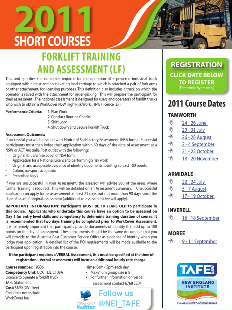 Assessment Outcomes: If successful you will be issued with Notice of Satisfactory Assessment (NSA form). Successful participants must then lodge their application within 60 days of the date of assessment at a NSW or ACT Australia Post outlet with the following: Original (blue/white copy) of NSA form Application for a National Licence to perform high risk work Original and acceptable evidence of identity documents totalling at least 100 points Colour, passport size photo Prescribed fee/s If you are unsuccessful in your Assessment, the assessor will advise you of the areas where further training is required. This will be detailed on an Assessment Summary. Unsuccessful applicants can apply for re-assessement at least 21 days but not more than 90 days since the date of issue of original assessment (additional re-assessment fee will apply). IMPORTANT INFORMATION: Participants MUST BE 18 YEARS OLD to participate in this course. Applicants who undertake this course have an option to be assessed on Day 1 for entry level skills and competency to determine training duration of course. It is recommended that two days training be completed prior to WorkCover Assessment. It is extremely important that participants provide documents of identity that add up to 100 points on the day of assessment. These documents should be the same documents that you will provide to the Australia Post Customer Service Officer as evidence of identity when you lodge your application. A detailed list of the POI requirements will be made available to the participant upon registration into the course. If the participant requires a VERBAL Assessment, this must be specified at the time of registration. Verbal assessments will incur an additional hourly rate charge. Course Number: 19336 Competency Unit: UOC TLILIC108A Licence to operate a forklift truck TAFE Statement Cost: $690 (GST free) Cost does not include WorkCover fee Time: 8am - 5pm each day Maximum group size is 8 For further information on verbal assessment contact 6768 2204
