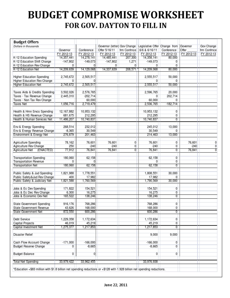 Budget Compromise Worksheet: For Gov. Dayton To Fill in