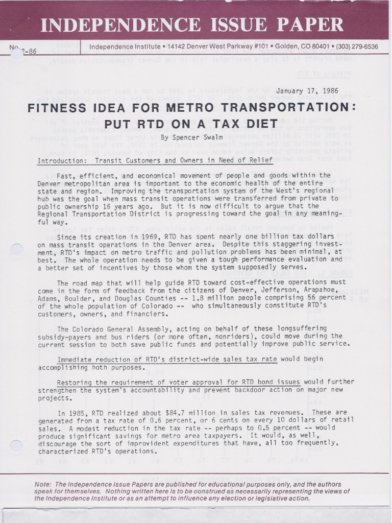 Fitness Idea for Metro Transportation Put RTD on a Tax Diet