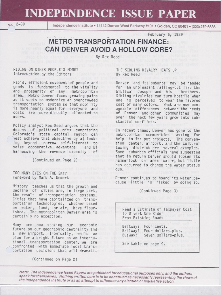 This issue paper provides important grist for the public policy mill in the major debates of 1989. Reed's analysis demonstrates the great expense of transportation options currently under consideration and the need for carefully considered funding mechanisms. Additionally, he identifies the potential for Denver and its neighbor communities to pursue self-interest at one another's cost. Clearly, what is needed is a cooperative strategy. But, as is discussed here, quick action must be taken before inertia takes over and we make crucial decisions by default.