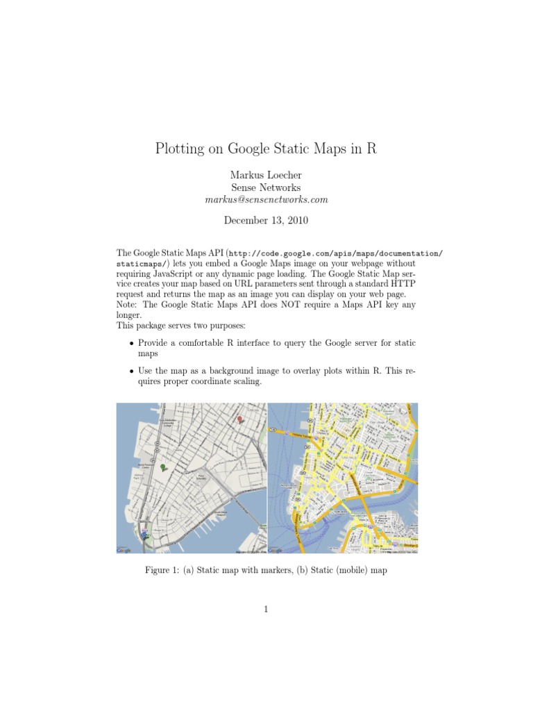 The Google Static Maps API (http://code.google.com/apis/maps/documentation/ staticmaps/) lets you embed a Google Maps image on your webpage without requiring JavaScript or any dynamic page loading. The Google Static Map service creates your map based on URL parameters sent through a standard HTTP request and returns the map as an image you can display on your web page. Note: The Google Static Maps API does NOT require a Maps API key any longer. This package serves two purposes: Provide a comfortable R interface to query the Google server for static maps Use the map as a background image to overlay plots within R. This requires proper coordinate scaling.