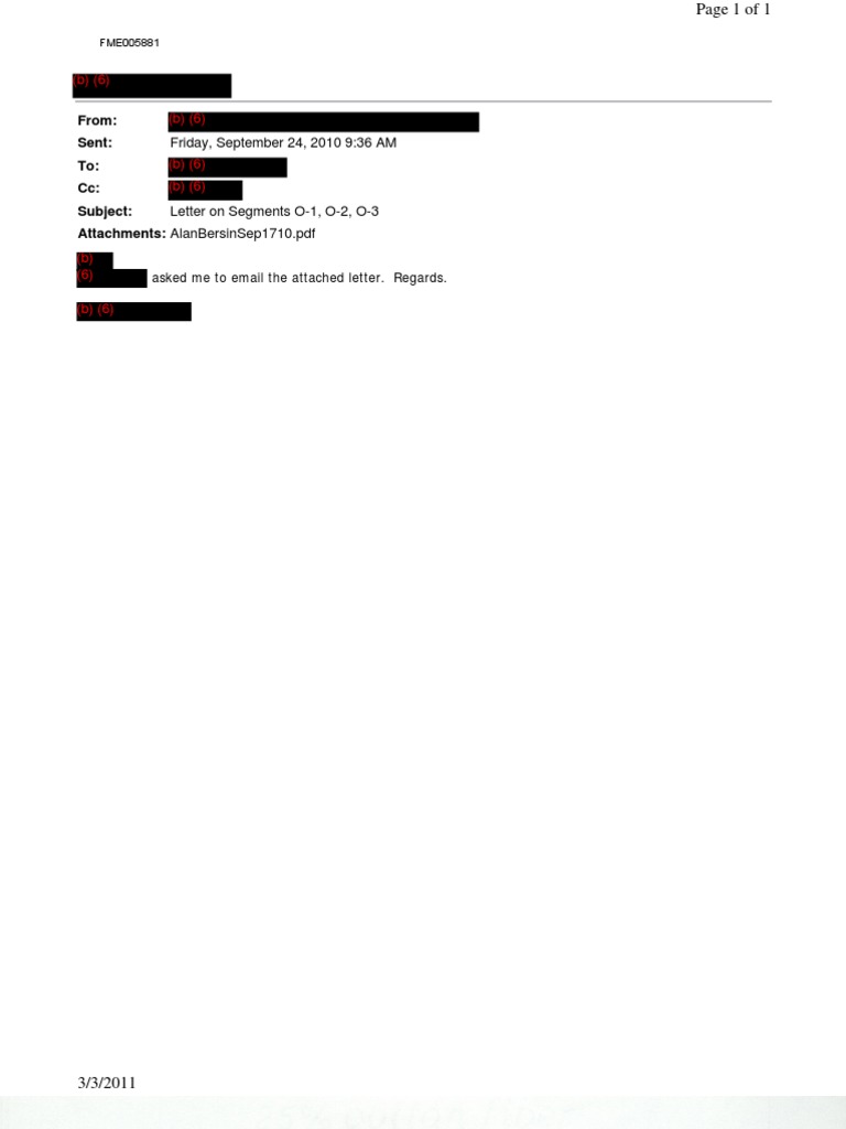 Scan of letter from Drusina at IBWC to Bersin dated Sept. 17, 2010 again denying approval of sections 0-1 through 0-3. Referring to the Baker reports he said, "While the CBP's technical staff have made considerable progress, the IBWC's obstruction and deflection criteria has not been met. ... Until other analysis can demonstrate that the fence will not deflect flows or increase the water elevation above our criteria, we must again deny our support for the proposed alignment of the fence in segments O-1, O-2, and O-3."
