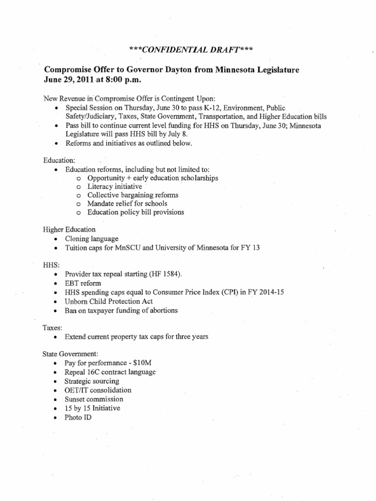 Compromise Offer to Governor Dayton from Minnesota Legislature June 29, 20ll,at 8:00 p.m.
