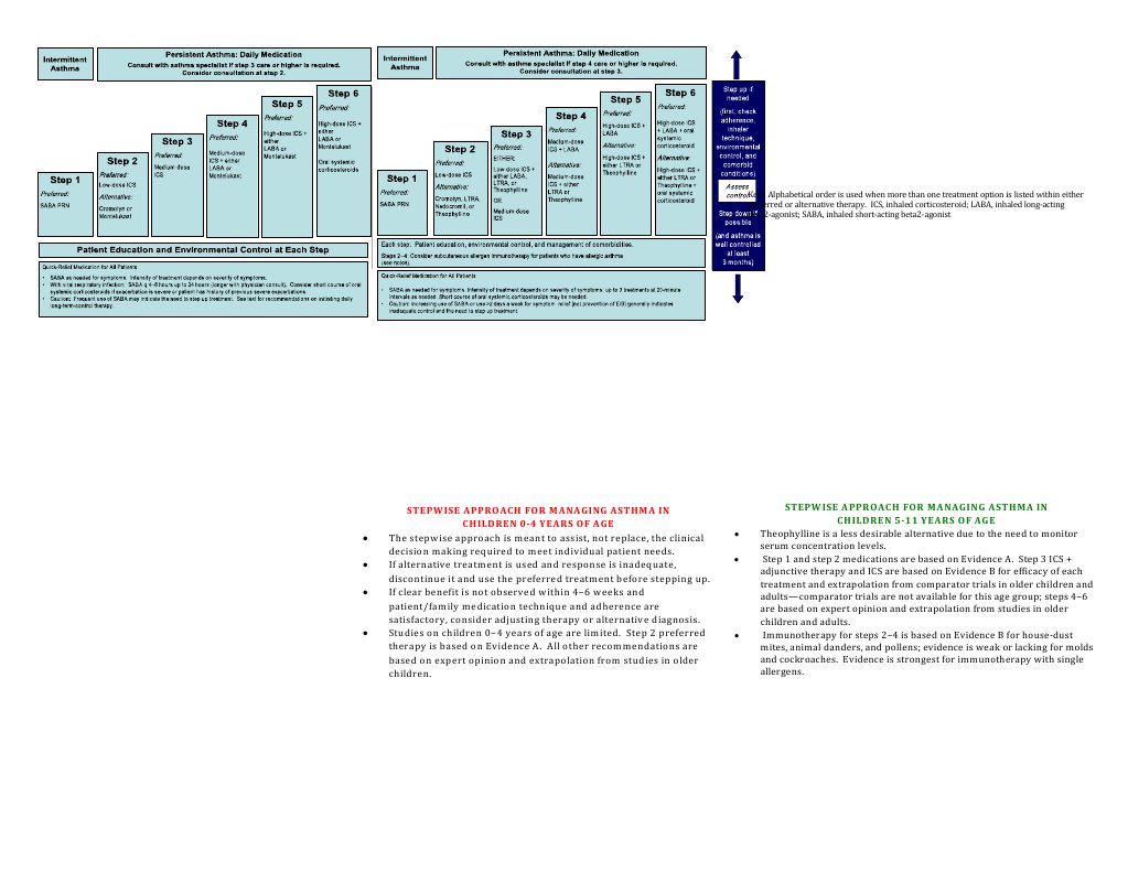 STEPWISE APPROACH FOR MANAGING ASTHMA IN CHILDREN 0-4 YEARS OF AGE The stepwise approach is meant to assist, not replace, the clinical decision making required to meet individual patient needs. If alternative treatment is used and response is inadequate, discontinue it and use the preferred treatment before stepping up. If clear benefit is not observed within 4 6 weeks and patient/family medication technique and adherence are satisfactory, consider adjusting therapy or alternative diagnosis. Studies on children 0 4 years of age are limited. Step 2 preferred therapy is based on Evidence A. All other recommendations are based on expert opinion and extrapolation from studies in older children.